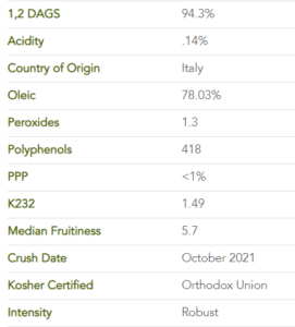This is a wonderful robust Coratina oil with the typical flavors of the variety. It is perfectly balanced with moderate bitterness, strong pungency, along with a strong aroma and fruitiness. It has mostly green, herbaceous qualities dominated by green banana, green tea, nettle, cinnamon, and black pepper. This oil tastes very fresh and full bodied.